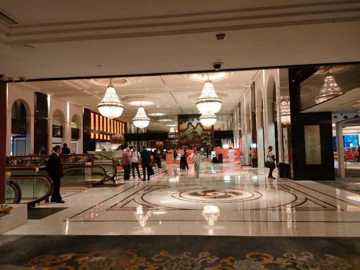天井が高く、シャンデリアが印象的なロビー。洋風とシノワズリーが溶け合った香港らしい雰囲気を感じられるロビーです。