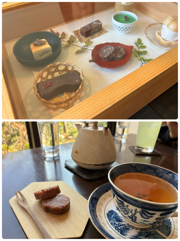 アールグレイは南部鉄瓶で、栗蒸し羊羹は栗やナッツが入っていて程よい甘さでとても美味しかったです。