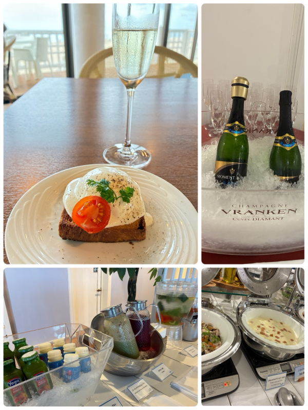 ラウンジでは、時間によって提供される食べ物が変わります。ティータイムにはスイーツが提供され、夕方になるとおつまみやお料理が増えます。