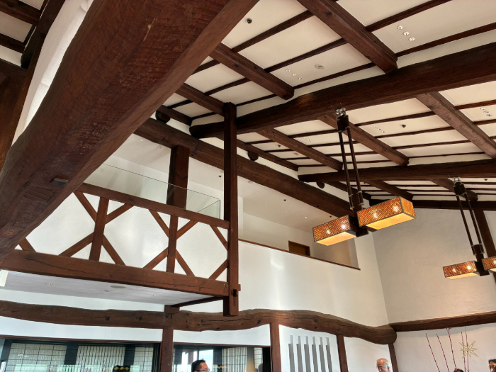 力強く美しい梁の数々、梁の配置は一本一本まで村野氏ご自身が指定されたとのこと。